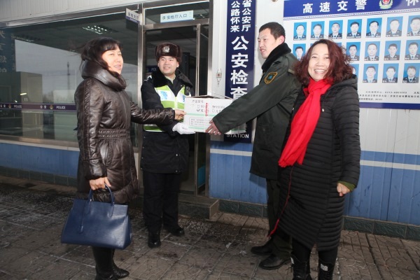 在京張高速公路冀京界懷來和宣化東公安檢查站,張慧敏一行與正在一線執(zhí)勤的交警一一握手慰問,對辛勤工作的交警表示誠摯的問候?倳嫀煆埢勖粽f,在這種能見度低、污染嚴(yán)重的霧霾和降雪的惡劣天氣條件下,交警同志不惜犧牲自己的健康,用堅(jiān)守和執(zhí)著保障過往司乘人員的出行安全和道路暢通,用辛勤汗水和艱苦付出維護(hù)了京張高速公路的道路交通秩序,交警同志們辛苦了。長期以來,京張公司與高速交警懷來、宣化大隊(duì)保持友好關(guān)系并結(jié)下深厚友誼。為此向辛苦工作在一線的交警同志送來問候,對一線交警恪盡職守、無私奉獻(xiàn)的精神表示由衷的敬意。